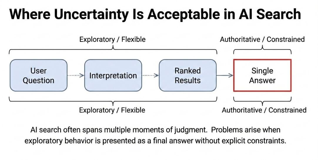 Both relied on the same probabilistic AI, but they carried completely different implications for user trust. Showing ranked results keeps uncertainty visible. Users compare options and form their own conclusions. Presenting a summary transfers interpretive responsibility from the user to the system, especially when that summary sounds confident.
