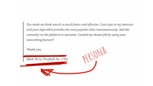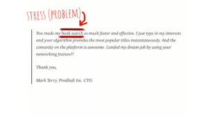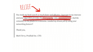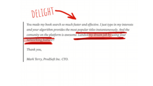 Delight is the sweetest part of the testimonial. It’s the part where your customers really feel good about using the product. Mark was not expecting to find his dream job on a book-sharing platform. But our networking feature enabled it to happen. It actually seems so obvious: you have an abundance of data about user preferences and their interests so it seems natural to leverage the data and create a delighter for the users. Tinder for business, so to speak.