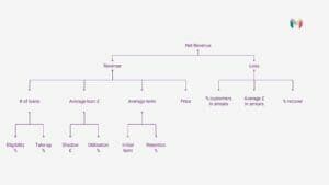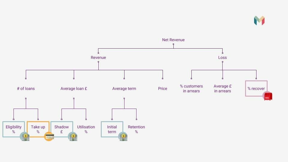 - Revenue: to increase revenue, we need to make more money (Shadow £) available to more people (Eligibility %), and build a good enough product that people want to take it up (Take Up %). These are the leading indicators, with revenue the lagging indicator.