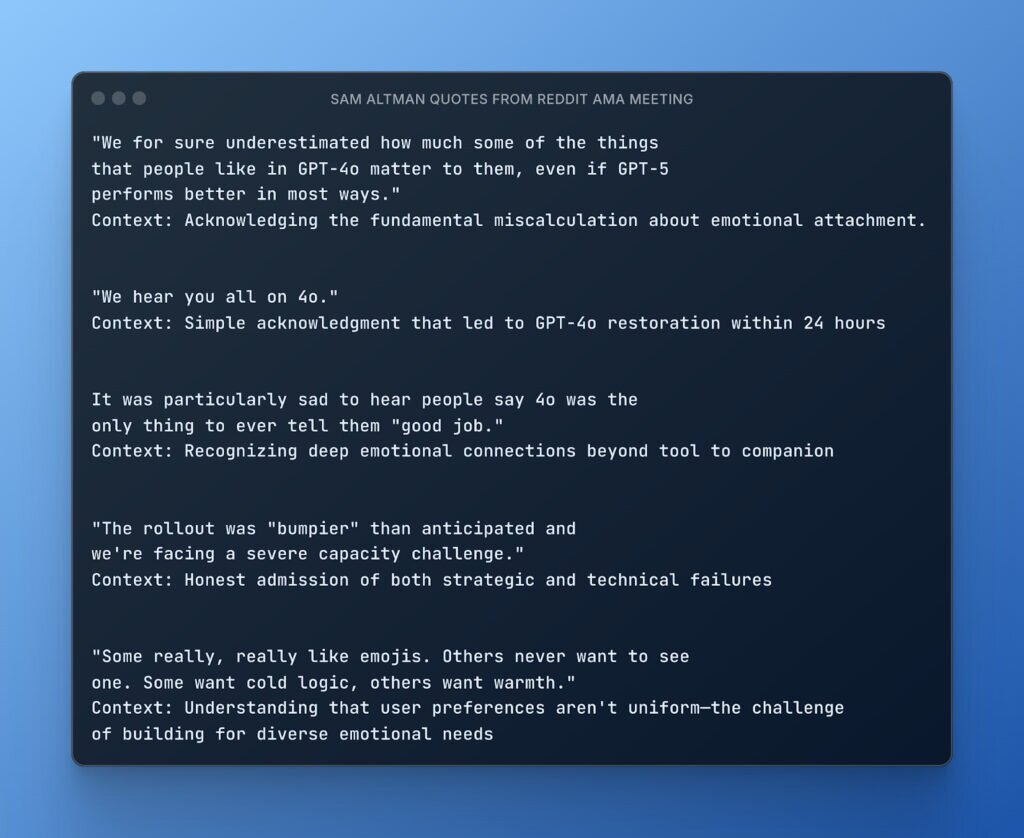 Users don’t just use your product; they integrate it into their lives. Change something fundamental, and you disrupt routines and sever emotional ties. Altman admitted: "We for sure underestimated how much some of the things that people like in GPT-4o matter to them."