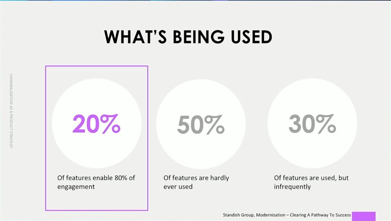 Stephanie cites The Standish Group study, which quantified that 20% of features drive 80% of engagement. Additionally, 50% of product features in your product do absolutely nothing.