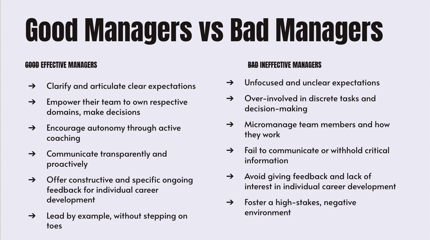 “In contrast,” Mariah continued, “Ineffective managers create unfocused environments, micromanage, fail to communicate critical information, avoid giving feedback, and foster high-stakes negative environments.”