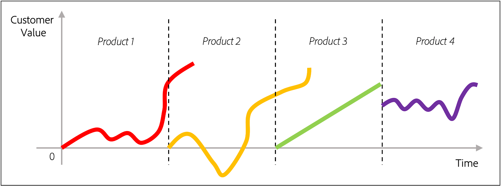 The worst case, yet unrealistic scenario, is depicted in the chart below, because it assumes the product manager’s inability to learn from any of their mistakes. Any product leader would prevent this type of trajectory sooner than later.