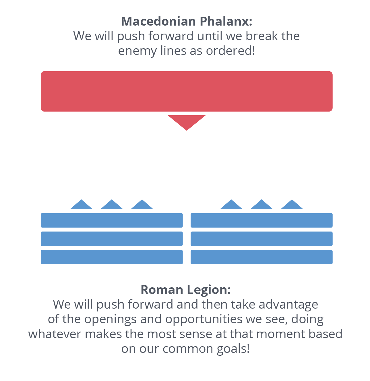 While the Romans had their fair share of bad commanders who would go against this approach, they tended to get killed in battle or relieved of their command pretty quickly. Commanders who trusted their centurions and offered them enough liberty fared much better. Again, compare with organisations where top management writes down the OKRs for their teams, making them feature deliverables, or even worse, puts them into a self-defined Gantt chart and throws a tantrum when things are not delivered “on time”.