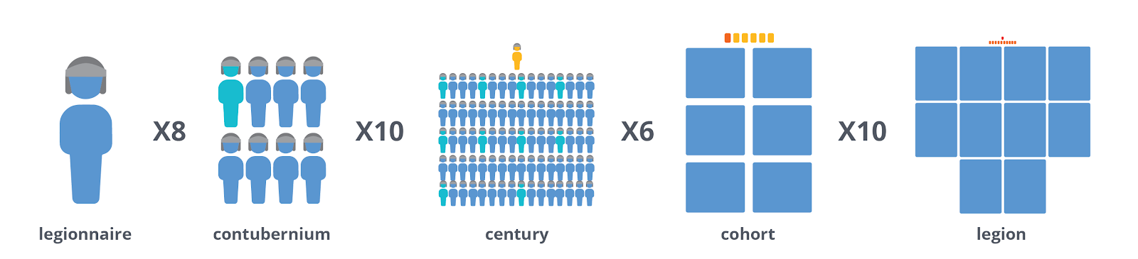 The Roman legion had an extremely streamlined reporting and ownership line: As the lowliest soldier—a legionnaire—you would be responsible for your armour, weapons, and tools, you would share one tent and one pack animal with seven fellow soldiers. This group of eight formed the smallest unit of the legion: the contubernium. From within the contubernium a spokesman would be elected, one of 10 spokesmen who would report and talk with the centurion: a career soldier and the head of (you guessed it) a century, composed of 10 contuberniums, 80 men in total. All communication and reporting were done strictly through each selected spokesman.