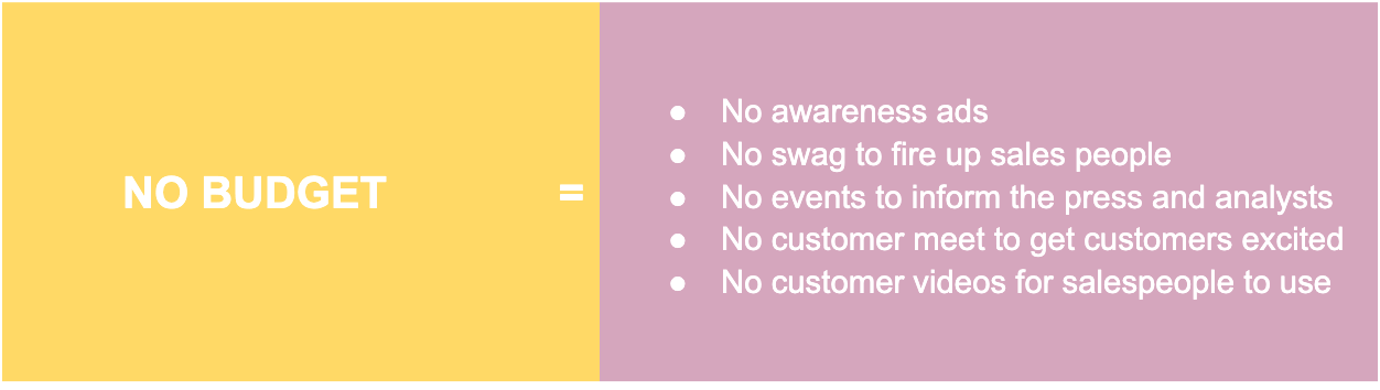 How to Tackle it: Product marketing will have to fight for a budget. Based on my experience a big bang is just not possible without a budget. Tell your leadership that: