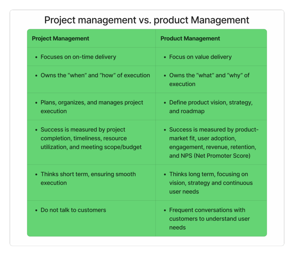 The table makes it clear: product managers focus on outcomes, while project managers focus on outputs. Many companies, especially in my region, misinterpret product management, which negatively affects junior product managers. But, this is not to say a product manager should not understand project management concepts but rather the project roles should be toned down if the product manager role is what is required.