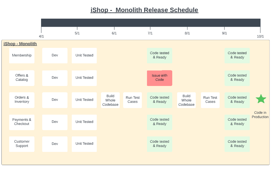 Now, imagine being the product manager for the payments team in this eCommerce company in a monolithic architectural pattern and your team wants to work to launch a buy now pay later (BNPL) functionality. It is month 3 and your team code is ready. But due to the monolithic architecture, the release team will need to coordinate among many teams, and hundreds of developers, resolve conflicts among them, merge the code into a single version, and produce a master version that waits in the queue to be moved into production. It also adds a lot of overhead to the delivery pipeline. Once the code base is built and tested, the team finds an issue with the unrelated code of the offers & catalog team. The offers and catalog team takes a few weeks to correct this code. The release team will then need to rebuild and test this whole code base again. In summary, an unrelated issue of another team impacted your ability to launch BNPL. This is what the Monolith did; it created speed and agility issues to launch new product features. For organizations dependent on technology to drive growth, this created a huge bottleneck in launching new features.