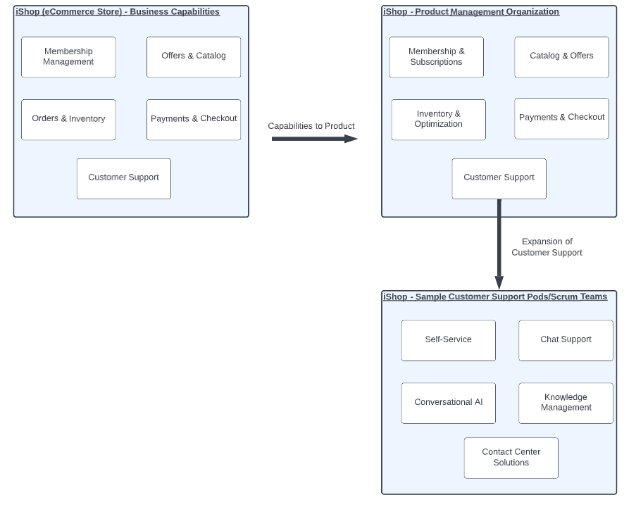 Below is a sample decomposition of iShop’s eCommerce website/app into various microservices/ capabilities. I further show how the customer support organization can be broken down into pods further.