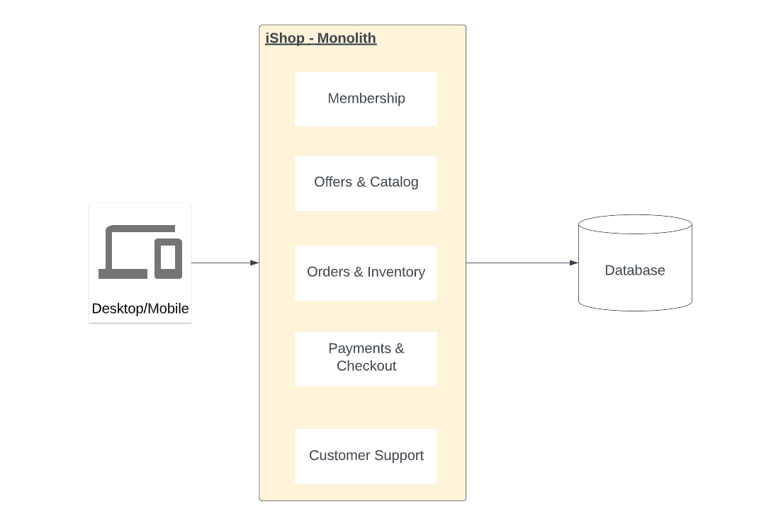 To understand this, we will need to look at the opposing end of the Microservices-based architecture which is a monolith. Let us look at this example through the lens of an e-commerce company named “iShop”. This company sells many items online and has seen immense growth over the last few years. iShop did not worry about best practices during growth and ended up building a Monolith as shown below:
