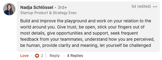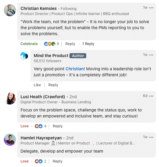 We also asked questions throughout the day. Here are some of the best answers to the most answered discussion topic: What advice would you give someone moving into a product leadership role?